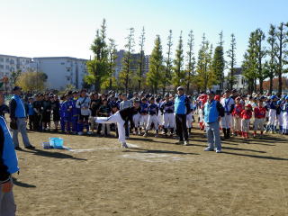 9時30分から体育協会志村事務長の司会のもと開会式が行われ、大会実行委員長学童野球連盟中山潤司副理事長の開会宣言、主催者体育協会高橋和実会長の挨拶、後援である練馬区志村豊志郎練馬区長・河口浩教育長よりご挨拶を頂き、また協賛者を代表し大陽ステンレス・スプリング株式会社横山正二会長よりご挨拶を頂きました。