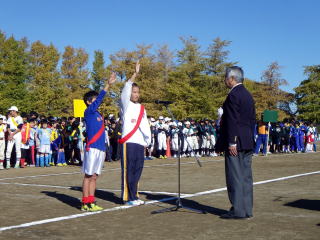 田中隆造大会副委員長より競技上の注意があり、最後に子供たちを代表して宮脇茂夫選手(泉新サッカークラブ)と原寿美乃選手(旭光ミニバスケットボールクラブ)が元気に宣誓しました。