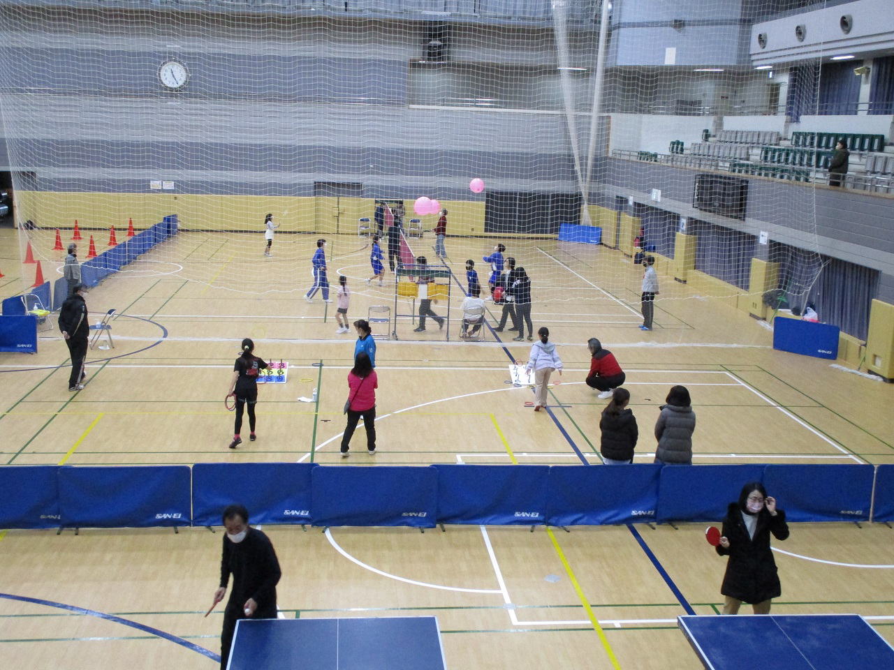 梅の香が漂うぽかぽかの一日、各会場にそれぞれ200名以上の参加者が訪れ、総合体育館では、ストラックアウト・バドミントン・ソフトバレーボール・ミニバスケット・卓球・輪投げ・なわとびを、大泉学園町体育館では、ストラックアウト・バドミントン・ソフトバレーボール・卓球・輪投げ・なわとびを楽しみました。