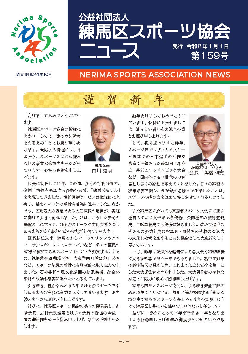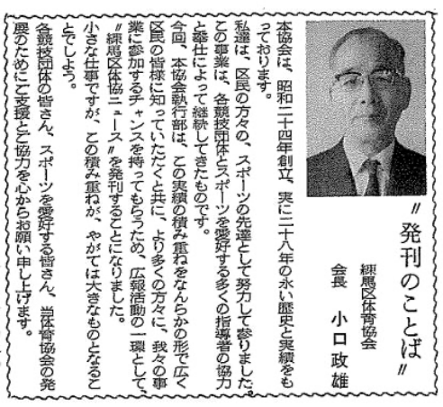 今回、本協会執行部は、この実績の積み重ねをなんらかの形で広く区民の皆様に知っていただくと共に、より多くの方々に、我々の事業に参加するチャンスを持ってもらうため、広報活動の一環として、“練馬区体協ニュース”を発刊することになりました。